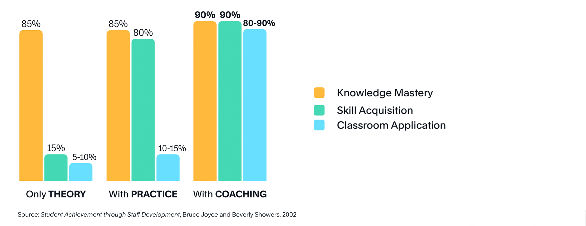 Experts in professional development have long understood the value of coaching. Research, like the classic work by Joyce and Showers, demonstrates its dramatic impact. Their work clearly shows that the addition of coaching to professional development models substantially increases the transfer of new knowledge into actual classroom practice above and beyond that of theory, modeling, and even practice.